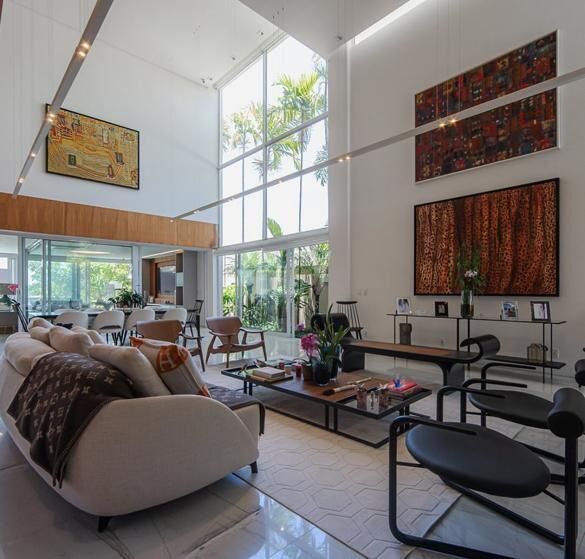 - Living amplo com pé-direito duplo, grandes janelas e vista privilegiada para o jardim lateral.